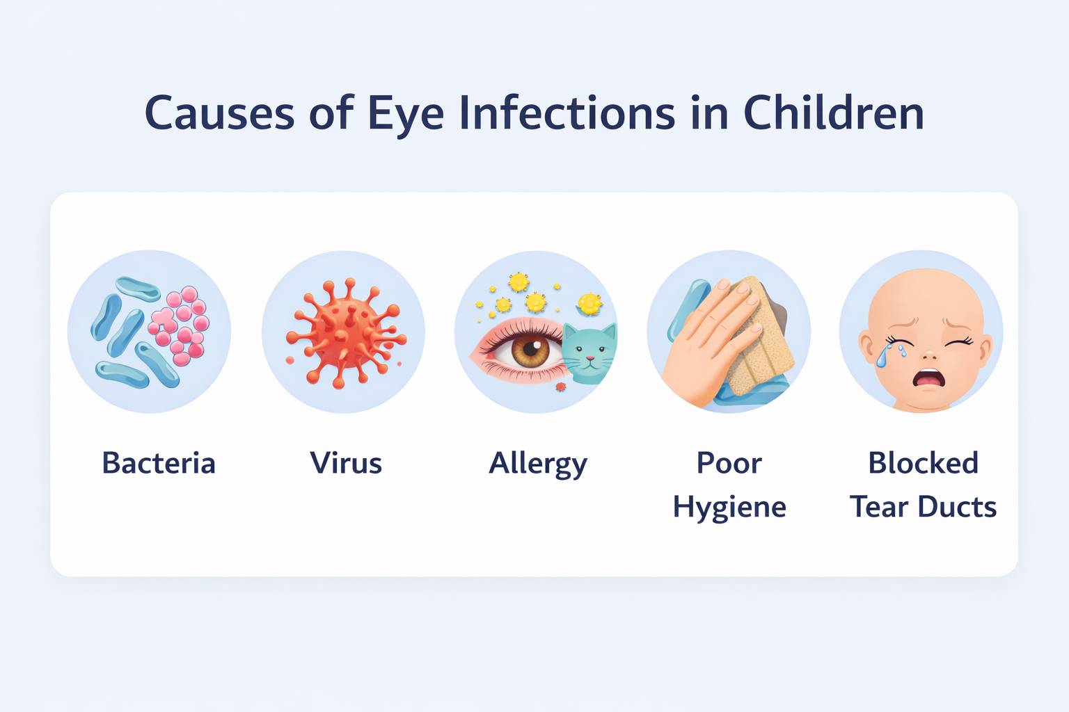 This guide explains eye infections in children, their causes, symptoms, treatment options, safe home care measures, and warning signs that parents should never ignore.